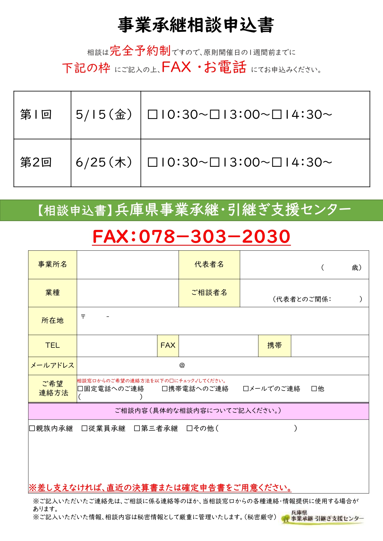 下記の内容にて、事業承継「出張相談会」を開催いたします